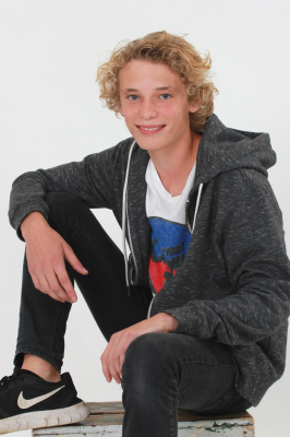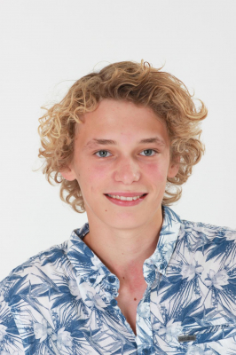 Krøller, lyst hår, blå øjne, smil.