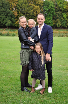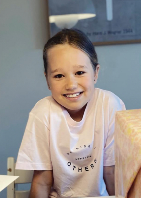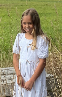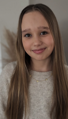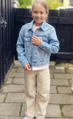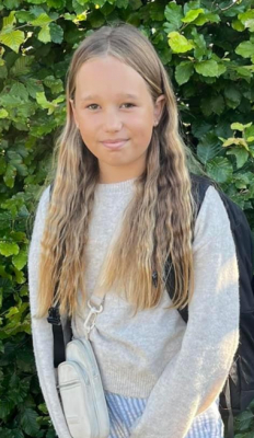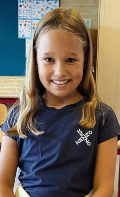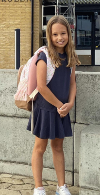 Store brune øjne, lyst hår med krøller i nakken. Højere pige med "lange" ben.