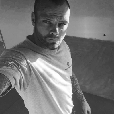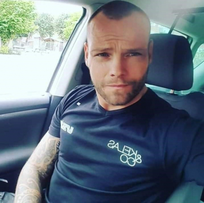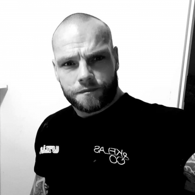 Meget blå øjne. Begge arme lukkede med tatoveringer Meget fit