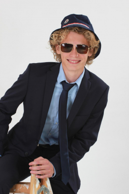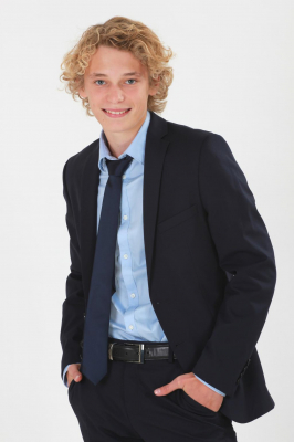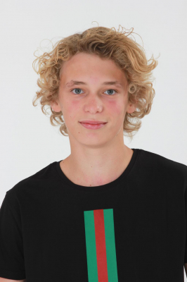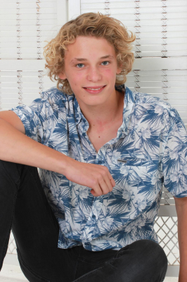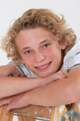 Krøller, lyst hår, blå øjne, smil.